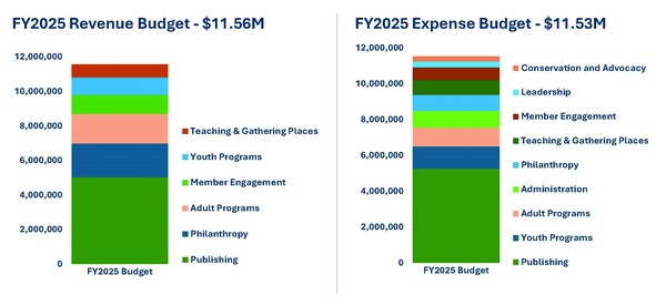 Figures 1a and 1b provide a glimpse into the diversity of funding and spending areas in our FY2025 budget. It’s worth noting that categories such as ‘Programs’ and ‘Membership’ span multiple components, including the activities of staff and volunteers alike. While our budget is $11.53M, our margin (revenue less expenses) is only $30K. This speaks to the level of complexity required in unifying and aligning our diverse programs with our nonprofit structure, and the role philanthropy can play to help us meet our objectives.