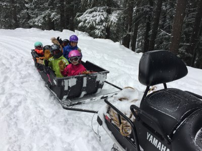 The Munchkin express takes our younger skiers and gear to the Turtle Tow for their lesson.