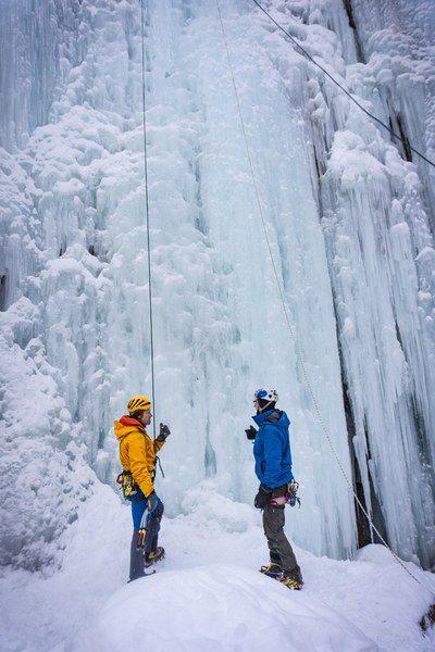 CMC Leader John Martersteck offers tips to Mountaineers Leader Sean Albert during a Ouray Ice Climbing trip. Photo by Val Hawks (@valhawks)