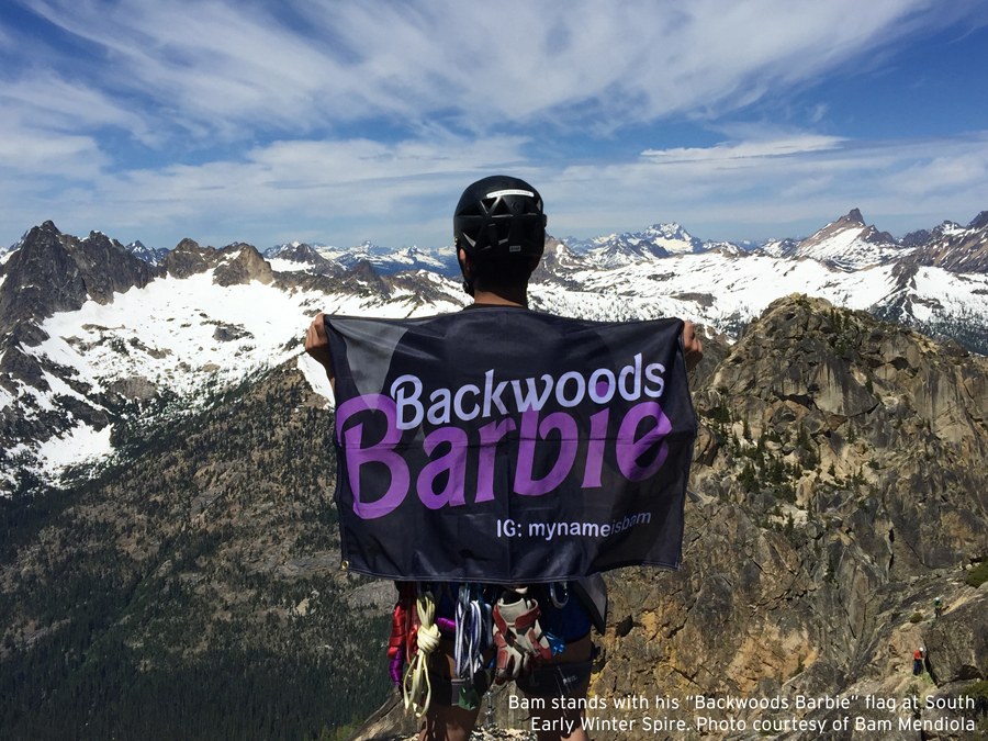 In 2015, after hiking countless miles, a friend affectionately nicknamed me “Backwoods Barbie.” It represents two of my identities — femininity and my love of the outdoors — that are often seen as antithetical when juxtaposed. As a climber, I fly my purple Backwoods Barbie flag from the summit of mountains and share my experiences on Instagram (@mynameisbam).