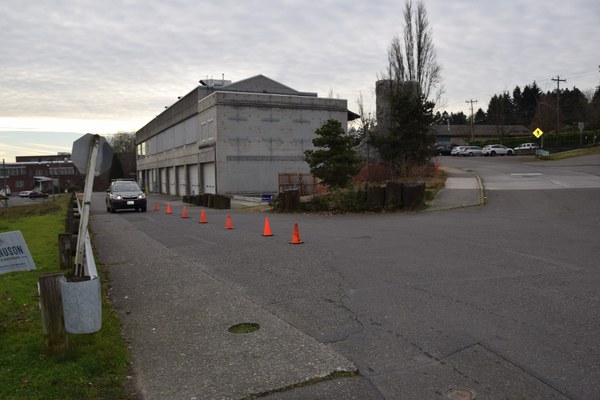 Western road facing north. Traffic cones divert traffic away from the area and warn drivers of the nearby activity.