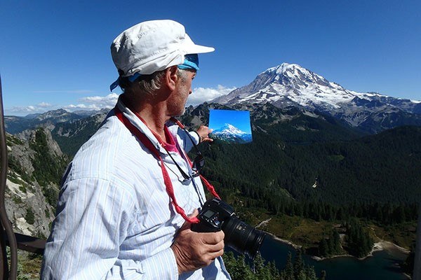 Alan On Tolmie Peak in 2015 with print of Rainier in 1993.