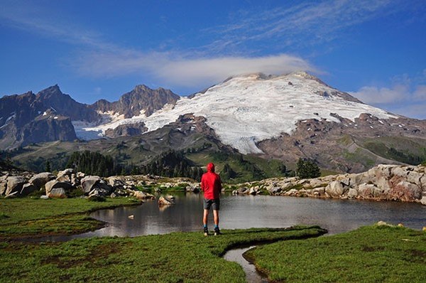 Gregg Oliveri viewing the Deming, Easton, and Squak Glaciers from below Park Butte, Mt. Baker, in 2021.
