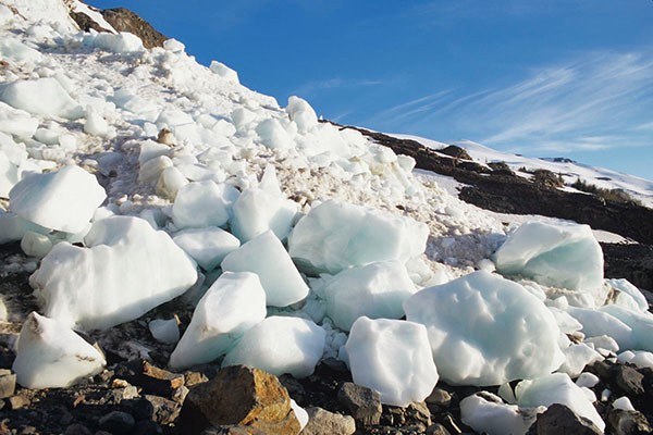 Evidence of a recent icefall below the snout of the Roosevelt Glacier, Mt. Baker.