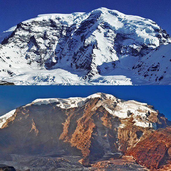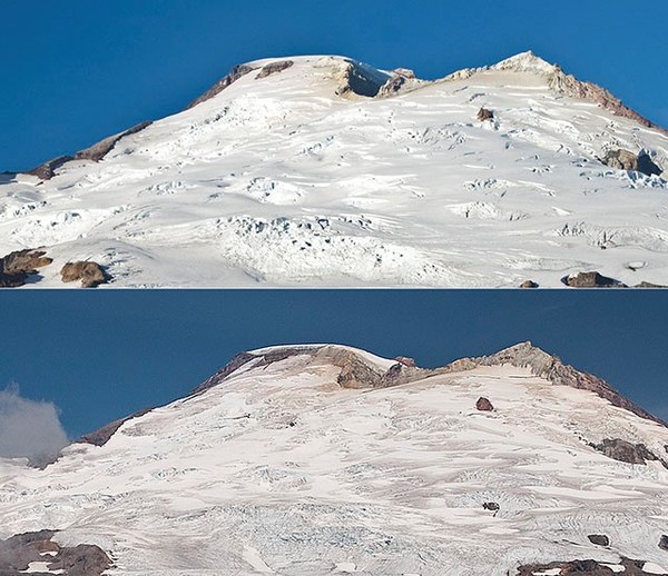 Comparison of the Upper Easton and Squak Glaciers of Mt. Baker. Taken August 2012 (top) and 2021.