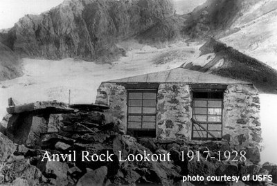 Of the four in extinction, the first was Anvil Rock (elevation 9,500 feet). Though built in the national park, it was operated by the forest service. Originally constructed of stone, with the fire finder outside, it was replaced by a wooden structure in 1928. In 1930, the park service took over operation — and in 1948, the entire structure was removed. The Collonades Lookout was built above 7,100 feet on the west side of the park in 1930 and replaced by the Sunset Park lookout in 1948, at a lower elevation. The last was a lookout at Crystal Peak, removed in the 1960's, and is still a popular hiking destination.