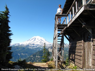 Note: The lookout is located on the summit of Shriner. Shriner is a classic hike, with old-growth forest opening up to alpine vistas and grand views of Mount Rainier. In late spring the upper slopes may still be snow covered, making route finding a bit of a challenge. Large noble firs are found just off the trail on the upper slopes.