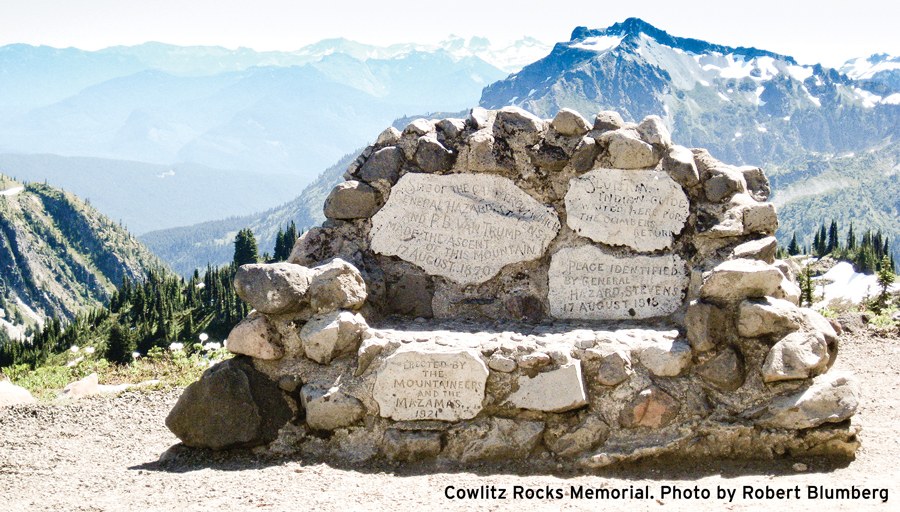 Route description: The trailhead is located by a red “Wrong Way” sign on the east side of the road. Hike the 4th Crossing Trail for 0.2 mile until you reach the Skyline Trail, where you turn right (the sign points to Paradise Glacier, 1 mile). Continue on the Skyline Trail until you reach the Stevens–Van Trump Monument. Fifty yards beyond the monument, follow the trail to Paradise Glacier (the sign states that the trail “ends 1.5 miles ahead”). Stay on this trail until it peters out, and then continue northerly with the Paradise Glacier on the left. Head up what appears to be a valley until you reach a col at 7200’, northwest of Cowlitz Rocks. Take the ridge (staying to the right, just off the ridge), and head southeast until you reach the highest point of Cowlitz Rocks (7450’). This final ridge portion of the route goes over rock scree.