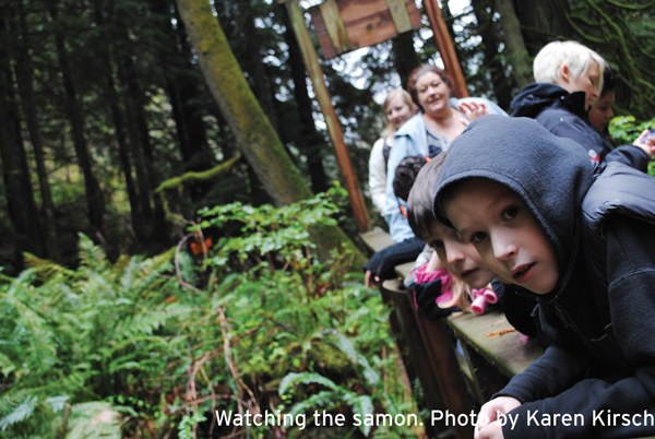 Walking down the steep switchbacks to the creek, I was startled by the sound of a herd of third graders yelling, “I see them! There they are!” I was being particularly careful to focus on the trail and keep a hold not only of my footing but my camera as well. I thought to myself what everyone else was thinking, “Boy, I didn’t bring the right shoes for this trip.” The ground was wet and everyone was excited to keep moving, which made navigating the exposed roots difficult and our trip down to Wildcat Creek slow going. I could feel the anxiousness rising when one boy stopped to tie his shoe. The whole line stopped. I took a breath and looked around at the dewy forest canopy covered in rich green moss. I was on a Salmon Safari.
