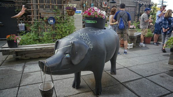 Before leading the trip, I had gone online to look for ideas to add to the scavenger hunt list. One thing I learned was that there was another pig on a public rooftop garden. How many of you knew there was a garden at the market on a rooftop, let alone another pig? We went off in search for it. Even though I had read of it's approximate location, I couldn't find where to access the rooftop. Some newer photography members (and my visiting brother) found it before I did. For future reference, there's a ramp behind Market Spice that goes directly to the garden.