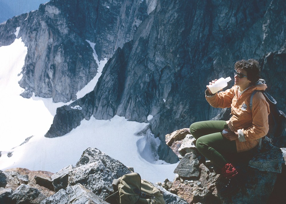 Marge Mueller was an avid outdoorsperson who became interested in our region’s mountains soon after moving to Washington in the 1950s. In the early 1960s, Marge joined Seattle Mountain Rescue, and there she met Ted Mueller. Soon after, their mutual friend Ira Spring invited them to be photography models on a climbing trip to Mount Baker. Matching male climbers stride for stride, she often dangled from belay while wearing attire fit for publication. Marge completed countless climbs and hikes with an unmistakable style, wit, and flair captured by Ira in many of his classic images.