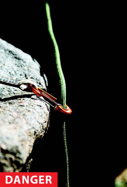 Carabiners are strongest when loaded along their spine with the gate closed. If the gate gets pushed open, the carabiner loses about half its strength. The UIAA certification for carabiners requires open-gate and cross-loaded strength of at least 7 kN (over 1,574 pounds) of force—plenty strong enough to hold the typical sport climbing fall. If the carabiner gets leveraged over an edge, however, it can break from as little as 2.5 kN (560 pounds) of force—even a small climber generates this much force in a typical climbing fall. Pay attention to avoid dangerous carabiner orientations. Beware of excessive wear on fixed quickdraws. The rope-end carabiner can wear to a razor-sharp edge and cut a rope.