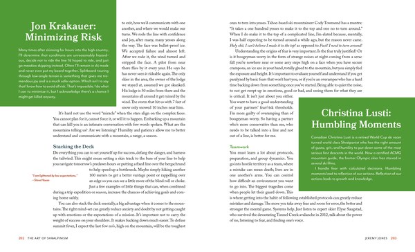 The Art of Shralpinism is a compendium of lessons hard won: quick tips, sound advice, and impactful stories. Learn ways to anticipate slope behavior or recognize clean lines, how to cut a cornice or develop safety protocols, how to build a fitness routine, the art of the turn, and keys to developing terrain and skills progression. Jones discusses the importance of mentors, the necessity and intensity of practice, the nature of risk, and the shape of failure.