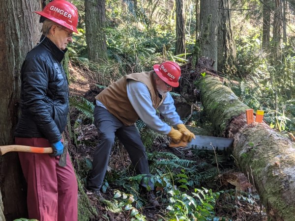 Last winter we received reports that trees were down on local trails at Tolmie State Park and in DNR’s Woodard Bay Natural Resources Conservation Area. We have a history of volunteering at both locations, so after contacting the area managers we arranged work parties. In the following months we made eight trips to Tolmie and six trips to Woodard Bay clearing the trail of downed trees, repairing boardwalks (puncheon), improving drainage, and learning new skills and trail techniques. We enjoy being involved in local work projects because we can take family and friends to enjoy the fruits of our labors. When we are out volunteering on local trails we often see people we know, which gives us an opportunity to invite them to join in.