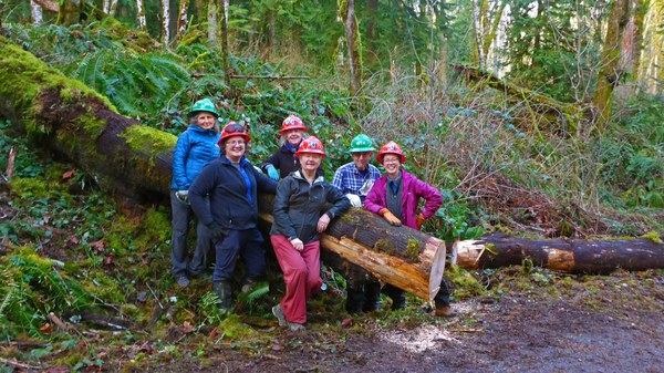 This winter Olympia Mountaineers volunteered on trails in Tolmie State Park and Woodard Bay Natural Conservation area. They made five trips to Woodard Bay, where they removed downed trees, cleared the paths of trees and debris, and used crosscut saws and related tools to clear fallen trees.