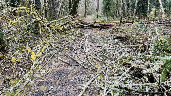 Debris over the trail at Woodard Bay. Photo by Ginger Sarver.