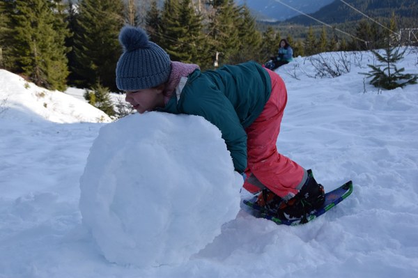A Winter Break Camper builds a snowman at Meany Lodge in January 2020. Photo by Katie Love.