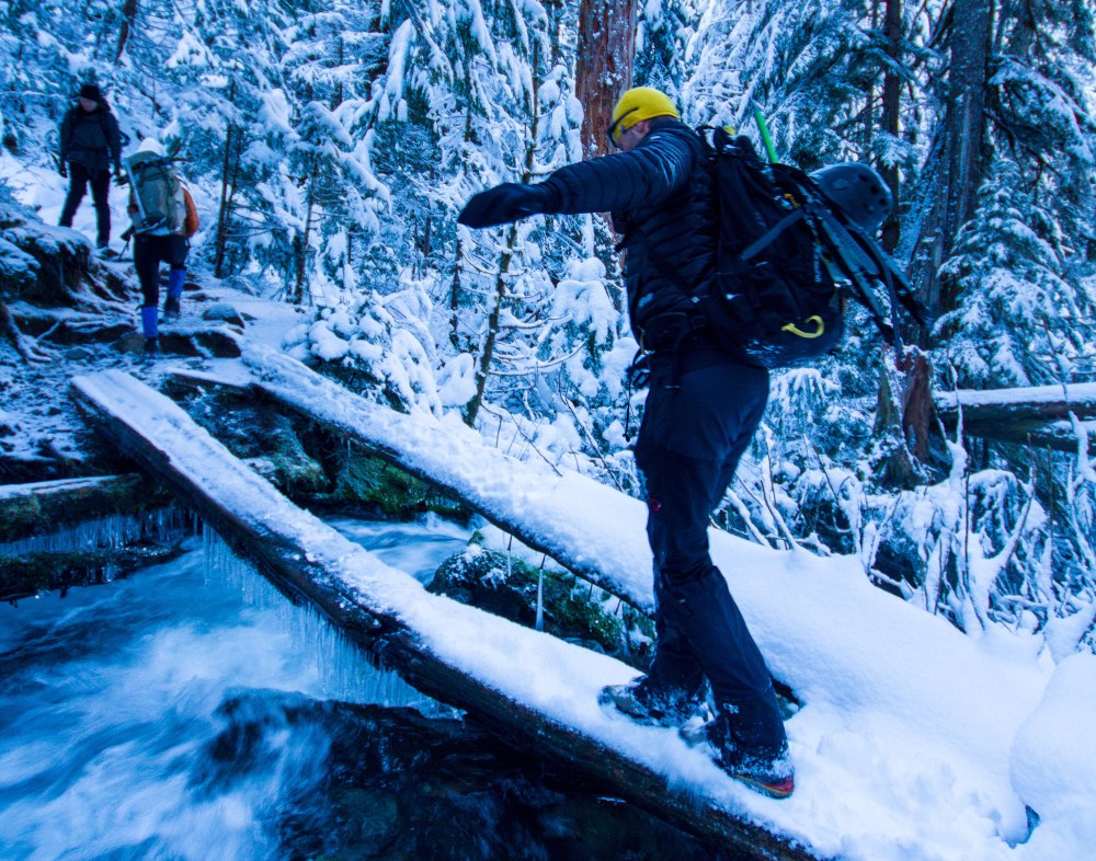 I considered halting the group and spending a few minutes using our shovels to reduce the amount of snow on the log and to provide a firmer, wider platform to cross. Instead, we started across.