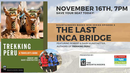Among the most exciting travel destinations in South America, Peru boasts a wealth of trekking opportunities from the Amazonian jungle to glaciated mountain ranges, from remote villages to ancient ruins, and much more. Join Mountaineers Books’ on November 16 for a live webisode exploring this "Last Inca Bridge". Featuring Robert & Daisy Kunstaetter, travel writers and adventurous ex-pats who co-authored the new book, "Trekking Peru: A Traveler’s Guide", learn about the wealth of trekking opportunities in Peru.