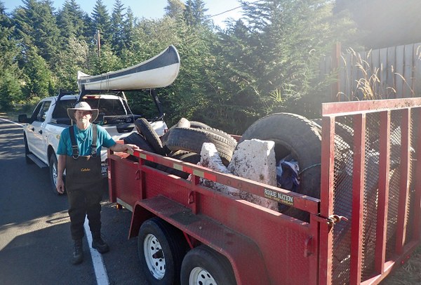 Mike Szumski stands beside a trailer filled with debris collected by the RiverSea Rangers after a day stewarding the Siletz River.