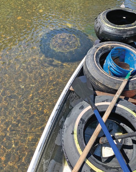 “I don’t think the tires are best left where they lie, so I take them out,” said Ken. Using the edge of a pickaxe, hoe, and boat anchor (if the water is deep enough), Ken and his friends gradually shake the tire loose until it can be surfaced, cleaned of gravel, and secured to their canoes. When required, Ken will don a wetsuit and dive underwater to wrestle loose the heavier tires that are too hard to hook with an axe. While working beneath the water’s surface, buoyancy is on their side, but once the tires breach, they can weigh anywhere from 25 to 180 pounds. “Those are the feats of success,” Ken shared, “when you get to remove big tractor tires.”