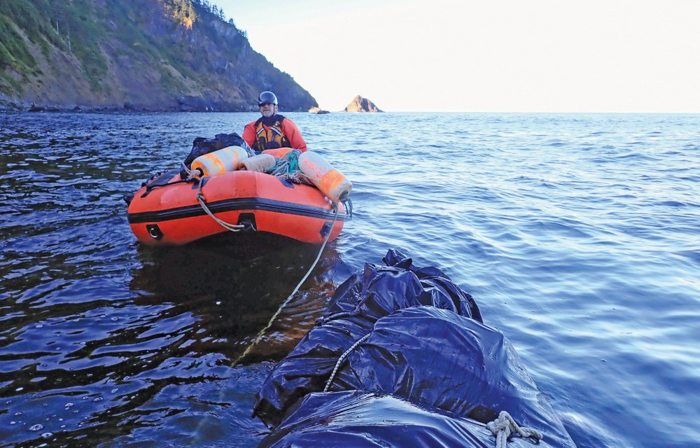 Another effective option – especially when there’s a low swell or when rougher waters are expected – is a kayak. Although smaller in size, “you can really get stuff into every nook and cranny of kayaks,” Ken explained, “and then bungee some of the clumsier stuff on top, like the buoys that won’t fit in a hatch.”