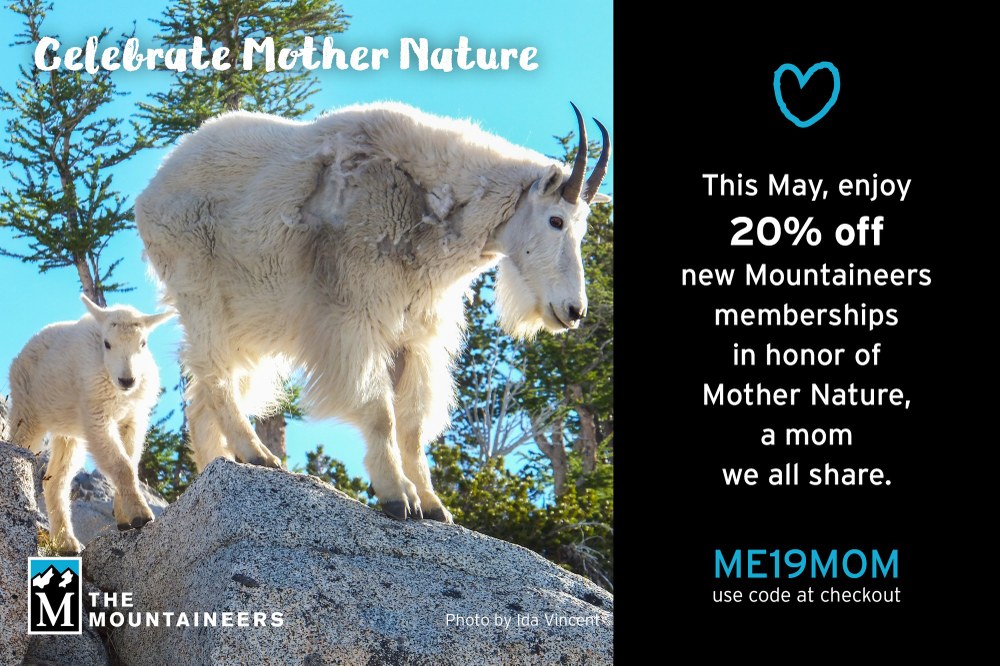 We are grateful to Mother Nature, and will continue to enjoy and protect her for generations to come. That's why we'd like to invite you to join us! This month, enjoy 20% off when you join The Mountaineers using promo code ME19MOM. Know you are supporting a community where your dues go toward protecting our wild places and help introduce future adventurers to the power and grace of Mother Nature.