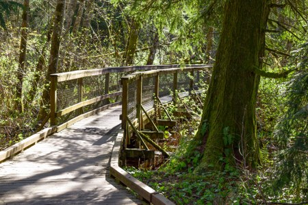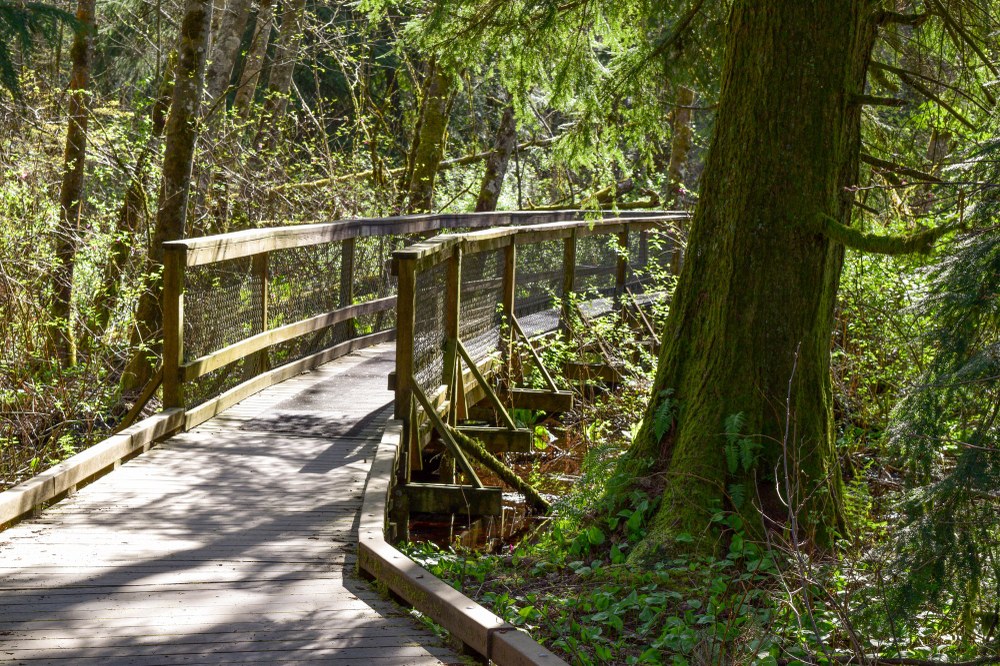 The West Hylebos Wetlands is one of those surprising places—a thriving oasis of green tucked away in a busy suburban area. Here, birds sing and frogs croak. Moss, lichen, and ferns attach to nearly every surface. Water oozes from the ground, flows, and pools. Very old trees, plus two historic cabins, give visitors a sense that they are entering a world of yesteryear. And a level boardwalk sweeps through it all, making it an ideal destination for feet and strollers (sorry, bikes and dogs are not allowed).