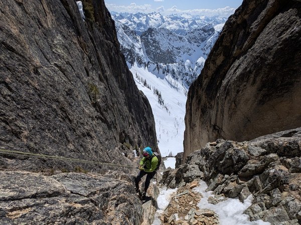 It turns out if you look up “efficiency,” this trip report comes up in results. In two teams, this crew climbed to the top of the couloir in one long running belay. The way down may have required some more time and patience, but it was worth it for these gorgeous views of the North Cascades.
