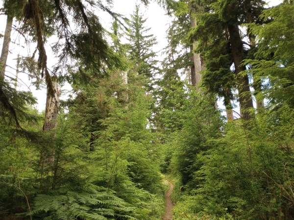 The trail was lush with western buttercup, ferns, and big leaf maples. Salmonberry, serviceberry, unripe red huckleberry, beadruby, and rhododendrons provided a backdrop of verdant green. Moss dripped heavily from low branches, ferns in some areas stood as tall as me.