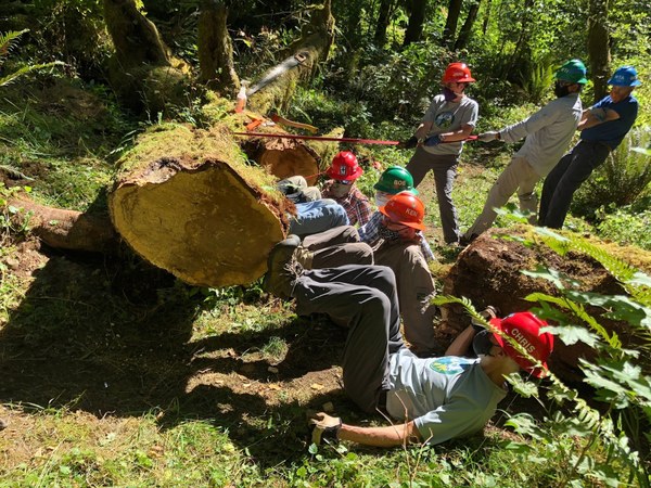 We were able to remove several large trees from the trail by single bucking and trading off with another person when getting tired. In that case, saw handles were sanitized with disinfectant before the new person took over. You will note that the picture of folks pushing the big log off the trail shows everyone wearing masks because they were closer than 6 feet for the minute or so it took to move the log.