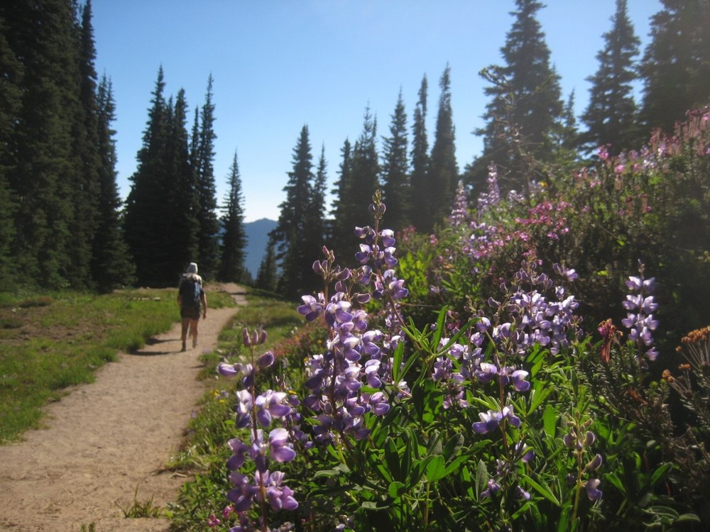 Once across the scree field we entered a dense forest, cool in the early morning light, where we traversed through a subalpine forest of dense hemlock, Alaskan yellow cedar, white bark pine, and subalpine firs. Right before we entered the forest, bistort, lupine, and scarlet paintbrush lined the trail. However, the wildflowers within the forest were few and far between, having already spent their blooms so as to set seeds for the fall.