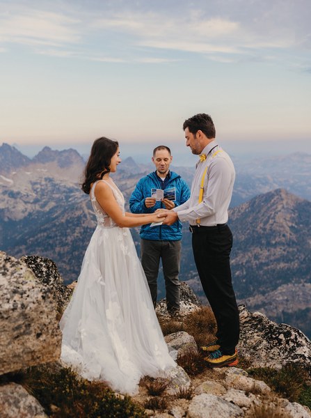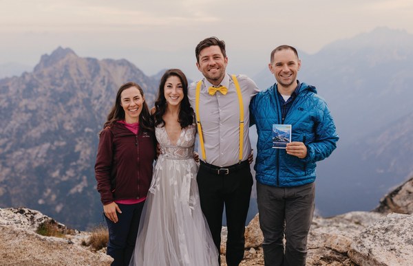 When planning an alpine elopement, it helps to have a community of fellow Mountaineers adventure enthusiasts. To bring our plan to life, we asked Rob Busack and Jessica Dyer, two Mountaineers and close friends, to join. Seasoned alpinists, Rob and Jessica had the climbing skills necessary to complete an alpine climb and support our summit ceremony goals. Rob, a climb leader who conveniently happened to be an officiant, agreed to marry us and Jessica served as a witness.