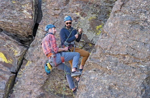 SYOC members, Ken and David, chatting about trad gear placement during a Youth Club parents climbing trip. Photo by Jeff Kisch.