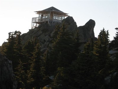 At first, the fire lookout would stay in a tent on a small tower 2. The first building in 1925 was a platform tower, then in 1932 a 45 foot L-4 cabin was built, and in 1964 a 67 foot TT flat was built 1. The original lookout was designed by Dan Evans, former governor of Washington State 4.