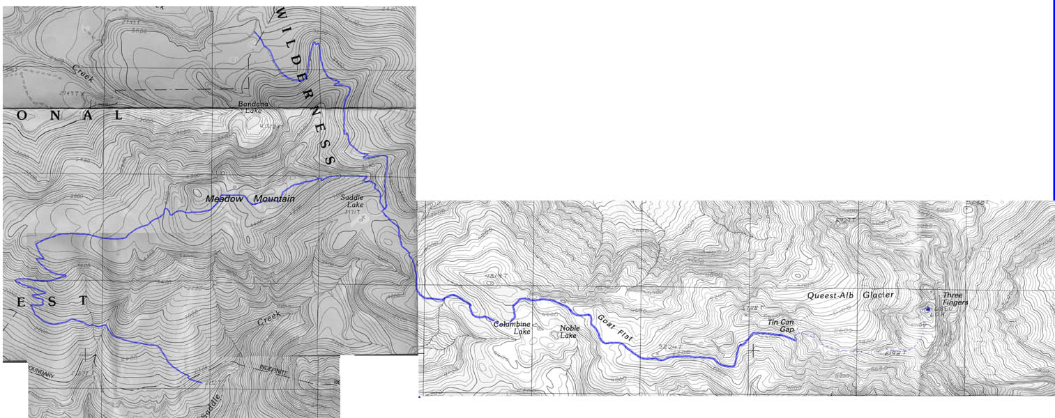 The USGS Whitehorse and Meadow Mountain, 7.5', 1989 maps were combined to show the trail-route to Three Fingers. Past the maintained trail (solid line), dashed lines represent the very approximate route to the Lookout based on eight-year old memory.
