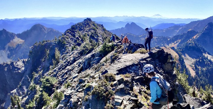 The Foothills Alpine Scramble Course, offered each spring, teaches students safe off-trail travel in both snow and rock, including how to use an ice axe to self-arrest, how to walk in crampons, and key rock scrambling techniques - allowing you to safely reach the majority of the peaks in the Cascades. The small class size and focused time frame provide a great learning environment and will give you a fundamental skill base as a mountaineer.