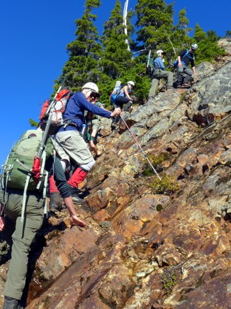 Alpine scrambling is non-technical climbing of ridges, peaks, and high routes. Glacier travel is not a part of alpine scrambling, and ropes are used only for emergency situations. However, you'll be trained to handle emergencies by other experienced Mountaineers.