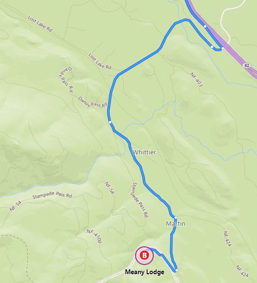 Searching for Meany Lodge on Bing Maps or Google Maps will provide reasonable directions.