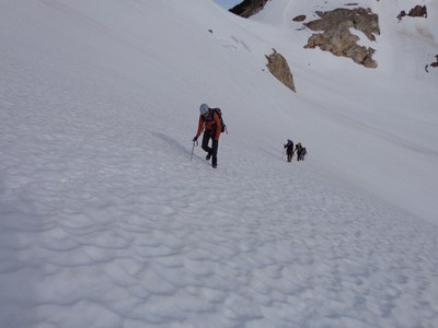 Review of French, German, American crampon technique. Self belay, climbing with one and two tools.