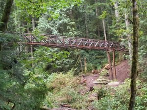 This hike will go along the TMT through a mossy coniferous forest and large ferns with a destination of point of the Murat's hiking bridge. This bridge was constructed in 2015 after two previous bridges had been destroyed in the past 50 years by "100 year storms".