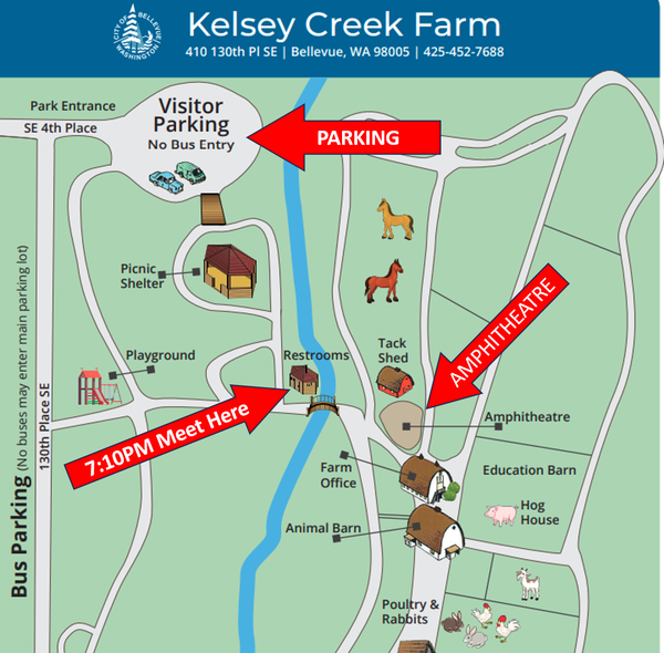 - 7:10PM, meet in front of the restrooms at Kelsey Creek Farm, 410 130th Place Southeast, Bellevue, WA, 98005 (see picture)