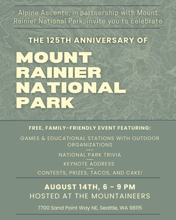 The celebration will take place on Wednesday, August 14th at the Seattle Mountaineers Program Center. This event promises to be a vibrant, inclusive, and educational experience, bringing together nature enthusiasts, climbers and mountain guides, community members of all ages, and organizations dedicated to preserving and enjoying the splendor of Mount Rainier National Park.